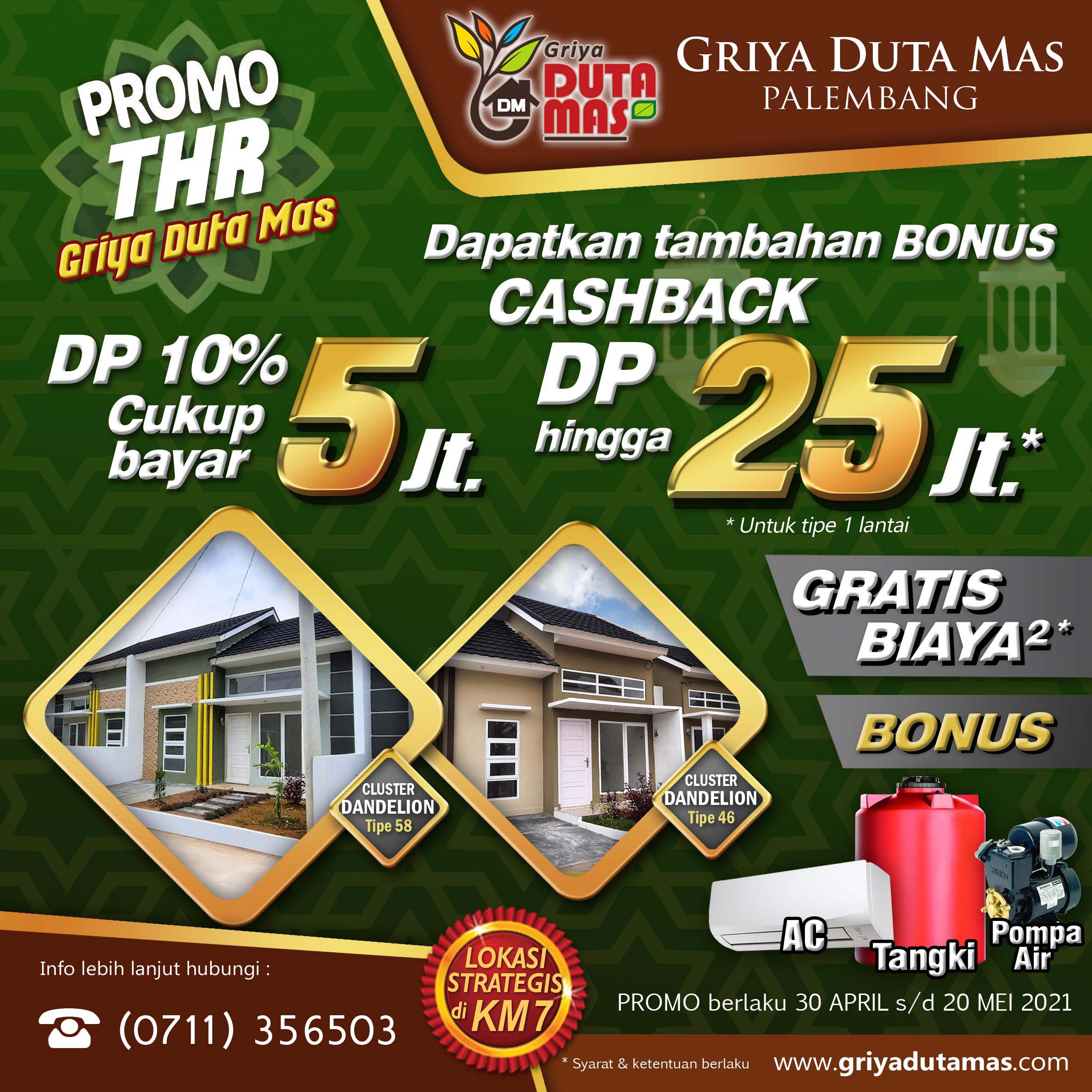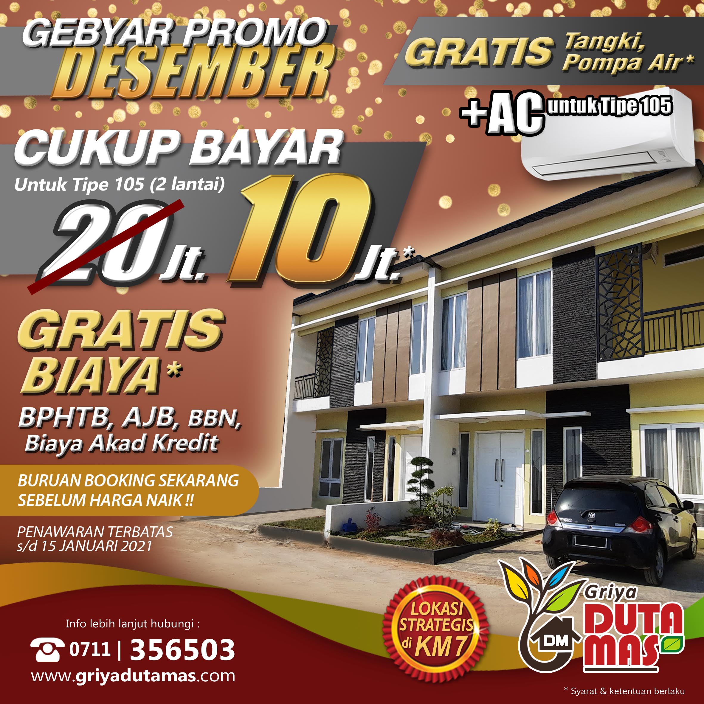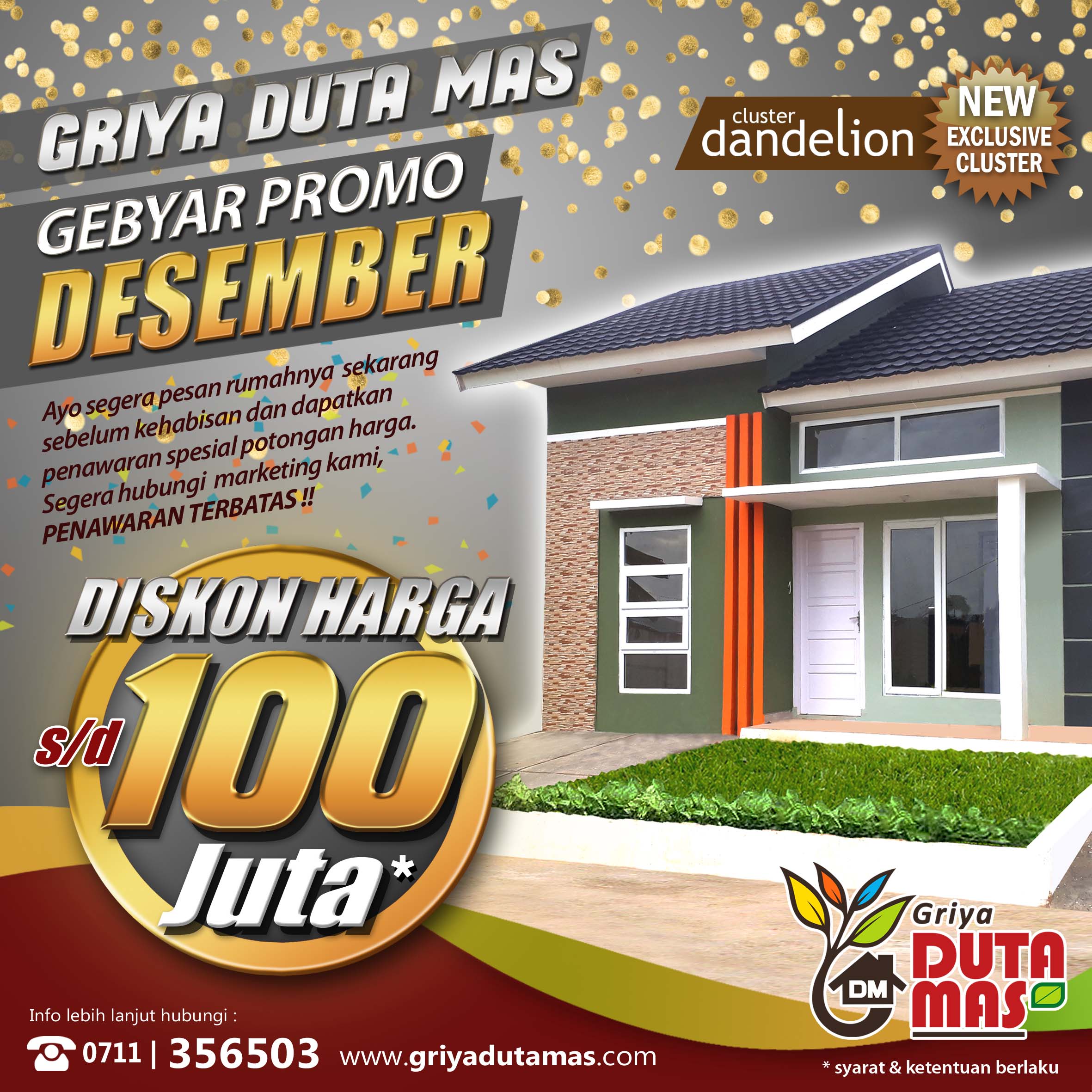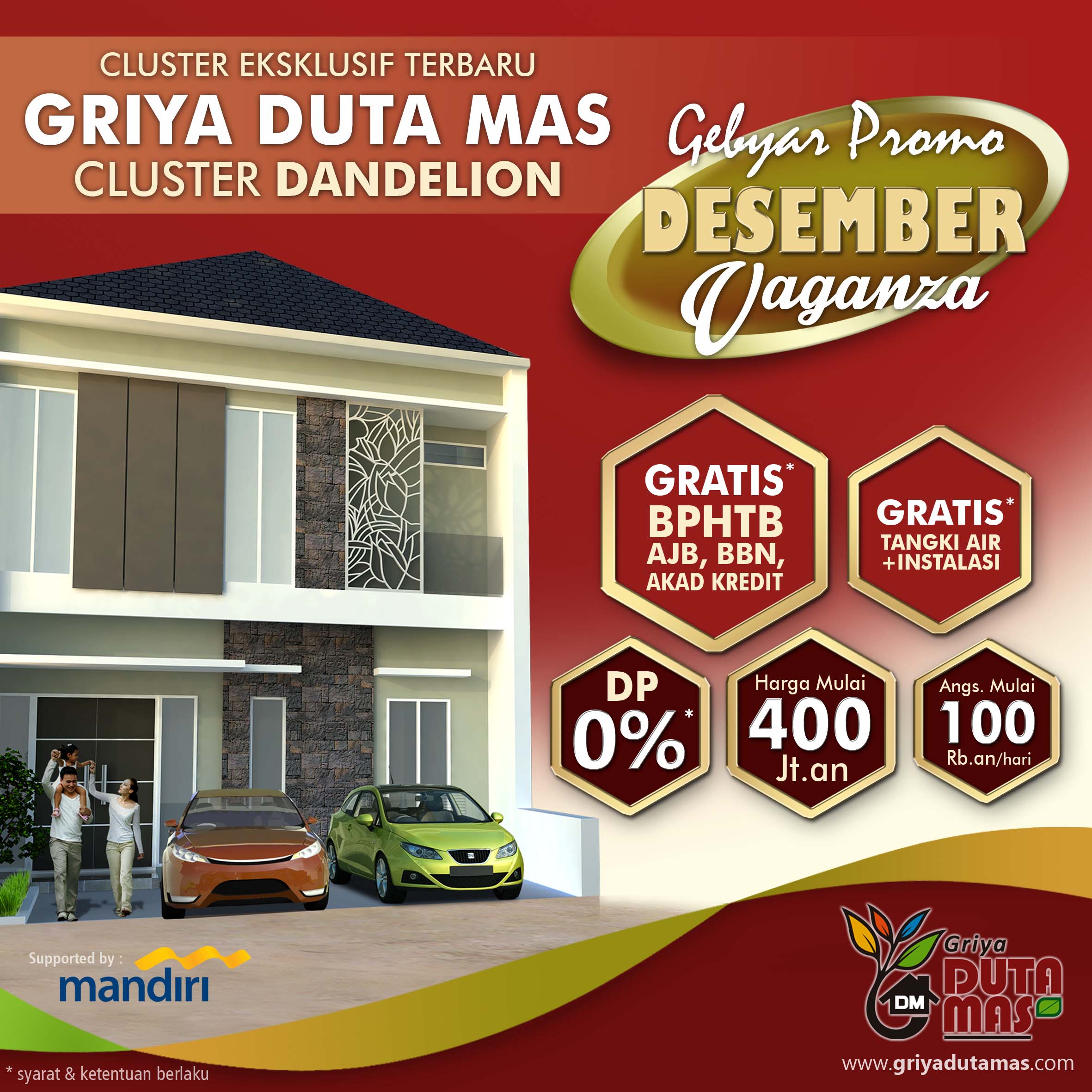 Menjelang akhir tahun, Griya Duta Mas memberikan promo menarik untuk para konsumen yang ingin memiliki perumahan terbaik untuk keluarga. Kami berikan gratis biaya-biaya dan gratis tangki air + pemasangan untuk setiap pembelian unit di cluster terbaru kami yaitu Cluster Dandelion. Dan dapatkan juga f...Selengkapnya
