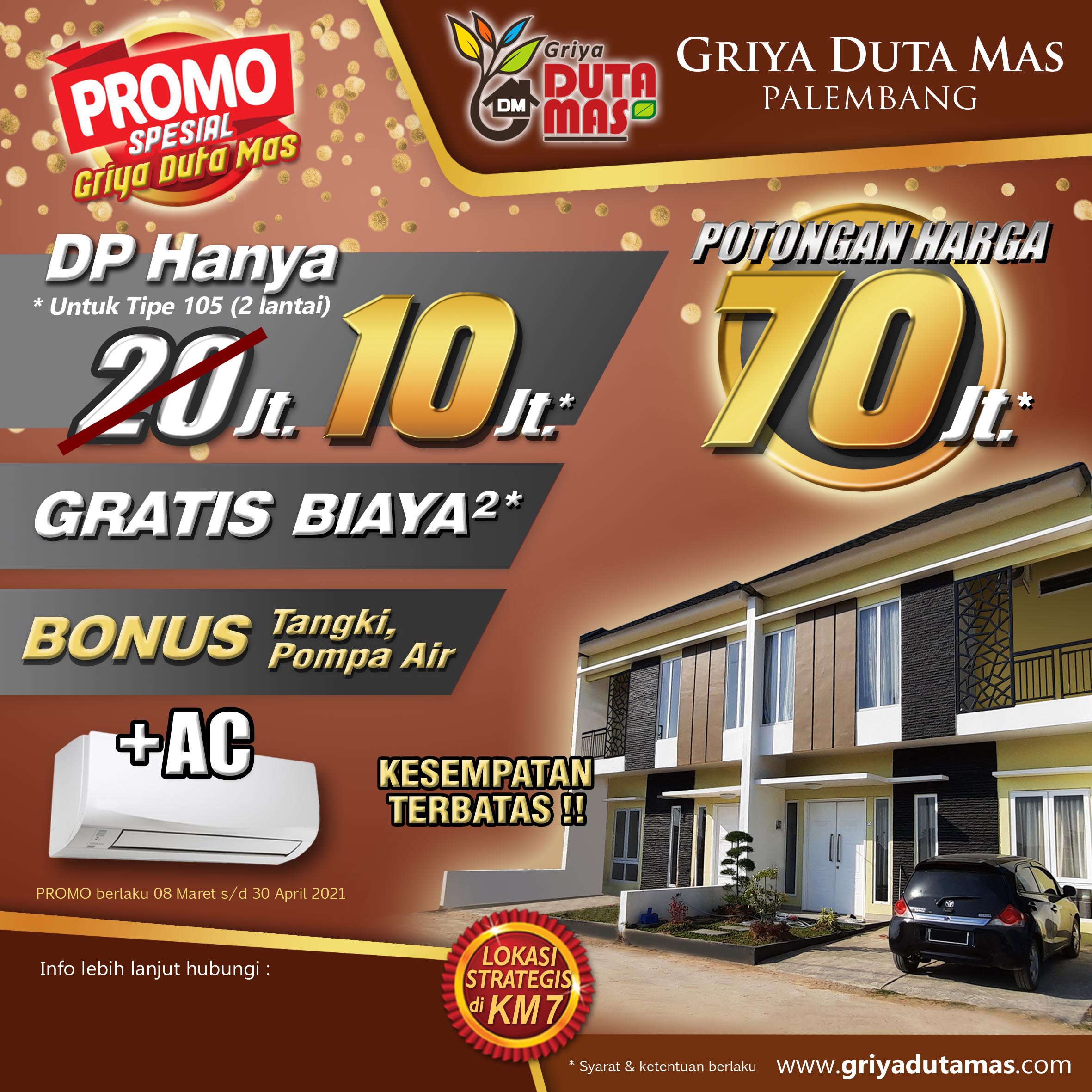 Kini semakin mudah punya rumah idaman. Jangan lewatkan Promo Spesial dari Griya Duta Mas, dapatkan potongan harga 70 Juta khusus untuk tipe 105 cluster Dandelion. DP hanya 10 Juta saja, sudah gratis biaya-biaya ditambah bonus AC, tangki, dan pompa air. Promo ini sangat terbatas, jadi jangan sampai k...Selengkapnya